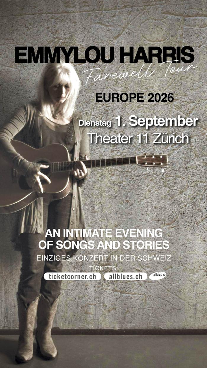 In Zürichs Theater 11 wird sie in dieser besonderen Atmosphäre Songs aus nahezu ihrer gesamten Laufbahn präsentieren: Akustisch, nahbar und voller Seele. Ein Abend mit Emmylou Harris bedeutet: Zeitlose Melodien, unvergessliche Stimmen und diese seltene Magie, die nur Legenden gelingt: live, ehrlich und von unbeschreiblicher Klangschönheit.